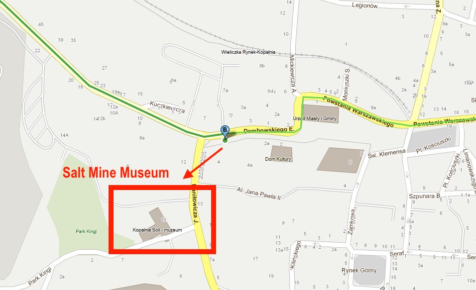 Zazwyczaj jeżdżą raz na pół godziny i dojazd do stacji, która Cię interesuje (Wieliczka Rynek-Kopalnia) zajmuje im około 20 minut. Dystans ze stacji do kopalni to niewiele ponad 500 metrów i bez żadnych przeszkód można pokonać go pieszo - poniżej znajdziesz mapkę z zaznaczoną najwygodniejszą trasą do szybu Daniłowicz.